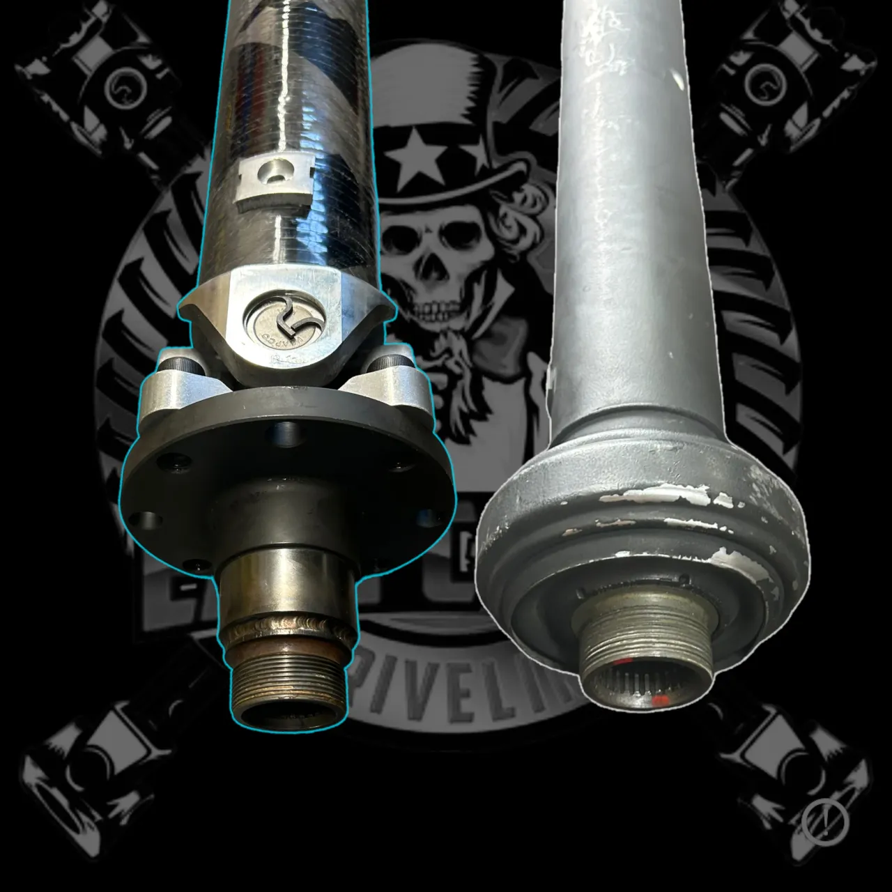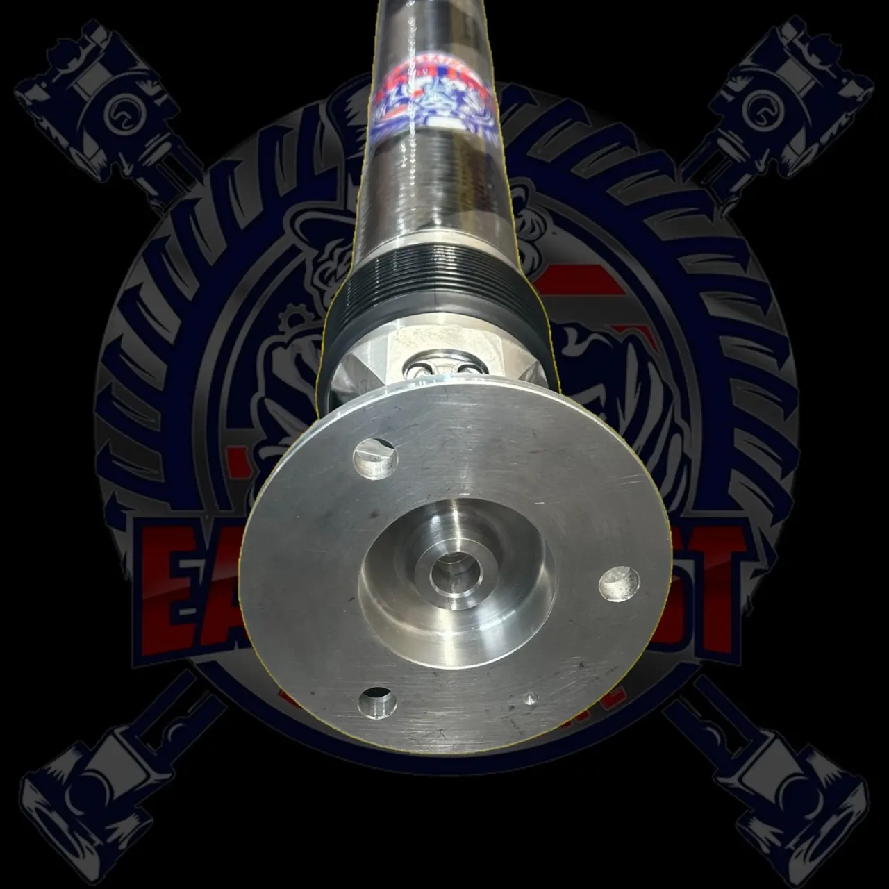 Карданный вал из углеволокна, изготовленный из трубы диаметром 3 дюйма и толщиной стенки 0,125 или 0,155 дюйма, с цельными карданными шарнирами серии 1350 и фланцевыми вилками из алюминиевого сплава, а также адаптером для удаления переднего соединительного элемента диаметром 110 мм. Адаптер дифференциала изготовлен на заказ с 27 шлицами и резьбой.